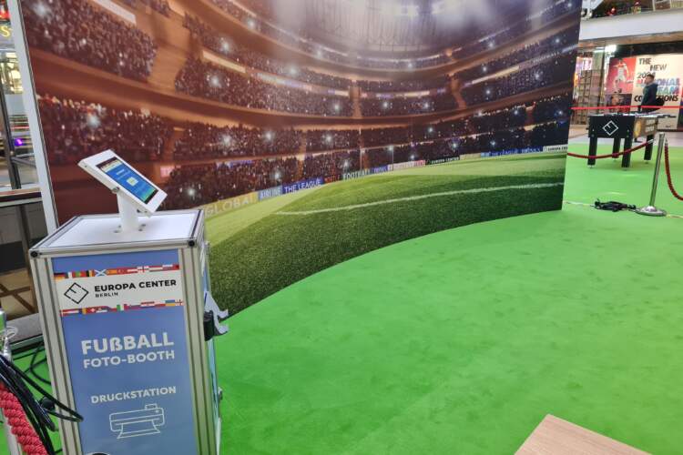 Das Europacenter in Berlin hat uns und die Veranstaltungstechnikfirma BMU mit der Konzeption eines Aufenthaltsbereichs thematisch zur Fußball EM 2024 in Deutschland beauftragt, der einige Aktivierungen und eine Fotostation beinhaltet. Während BMU sich um das Design und Equipment für die gesamte Fläche gekümmert hat, haben wir die Planung und technische Umsetzung der individuellen Fotostation übernommen. Die Besonderheit war in dem Fall, dass keine klassische Fotobox gewünscht war. Das Ziel war es in Kombination mit einer großen Fotowand, die das Stadioninnere abgebildet hat, und einem grünen Boden es aussehen zu lassen, als wären die Besucher auf dem Fußballfeld in einem Stadion.
