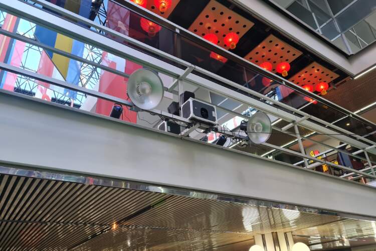 Vor Ort haben wir mit ausreichendem Vorlauf die konkreten Gegebenheiten geprüft und eine individuelle Umsetzung der Fotostation geplant. Für die Bedienung der Gäste wurde eine Station direkt neben der großen Hintergrundwand konstruiert. An dieser haben die Gäste den Fotovorgang gestartet, konnten ihr finales Foto anschauen und dieses sofort ausdrucken oder sich direkt per E-Mail zuschicken. Im Gegensatz zu einer klassischen Fotobox, wie zum Beispiel unsere Fotobox Premium, befand sich die Kamera jedoch nicht direkt an bzw. in der Fotostation, sondern wurde mithilfe individuell angefertigter Halterungen am Geländer des oberen Geschosses montiert. Ebenfalls wurden dort zwei Studioblitze mit ausreichender Stärke für die größere Entfernung angebracht, sodass das Foto aus der Vogelperspektive möglich war und ausreichend belichtet wurde.