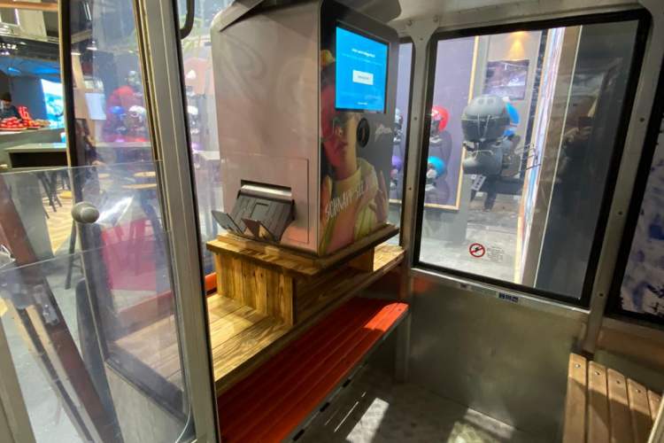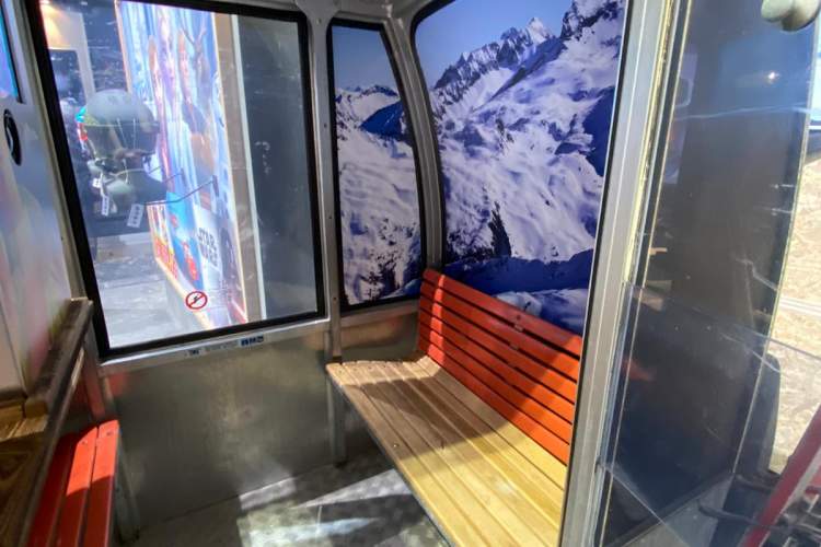 Die Fotobox Basic gliederte sich mit der silbernen Lackierung ideal in den Innenraum der Gondel ein und ergänzte das Gesamtbild. Um die Marke Alpina Sports auch innerhalb der Gondel für die Gäste sichtbar zu machen, wurde ein passendes Branding im Corporate Design der Firma erstellt und zusätzlich angebracht.