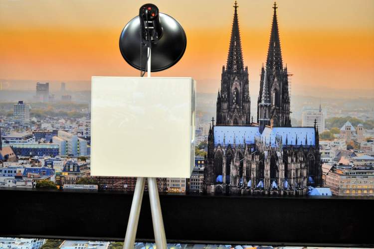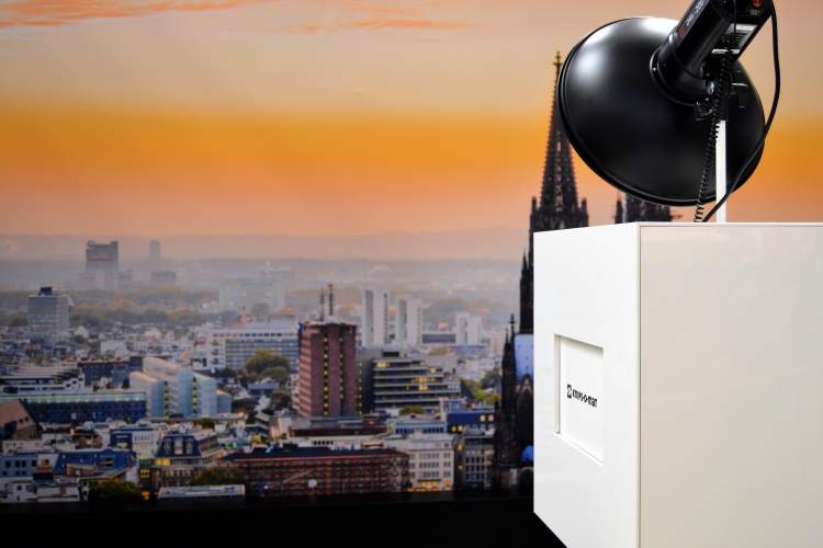 In Zusammenarbeit mit unserem Messebaupartner, welcher das gesamte Standkonzept für den über 120 Quadratmeter großen Messestand entwarf, integrierten wir eine unserer Fotoboxen (Model: Fotobox Premium) in das Standkonzept der hagebau Handelsgesellschaft für Baustoffe mbH & Co. KG.. Eigens für den Messestand wurde eine 3 x 4,50 Meter große Fotowand errichtet, welche die Skyline von Köln abbildete, sowie der davorliegende Boden mit einem speziellen Fotoboden foliert, um eine Draufsicht auf die Stadt Köln zu erzeugen. Zusätzlich wurde eine Sitzfläche in Stahlträgeroptik vor das Motiv gebaut, um in Anlehnung an das legendäre New Yorker Foto „Lunch atop a Skyscraper“, aus dem Jahre 1932, einzigartige Bilder zu erschaffen auf denen die Messebesucher ihre Beine hoch über der Stadt Köln baumeln lassen konnten.